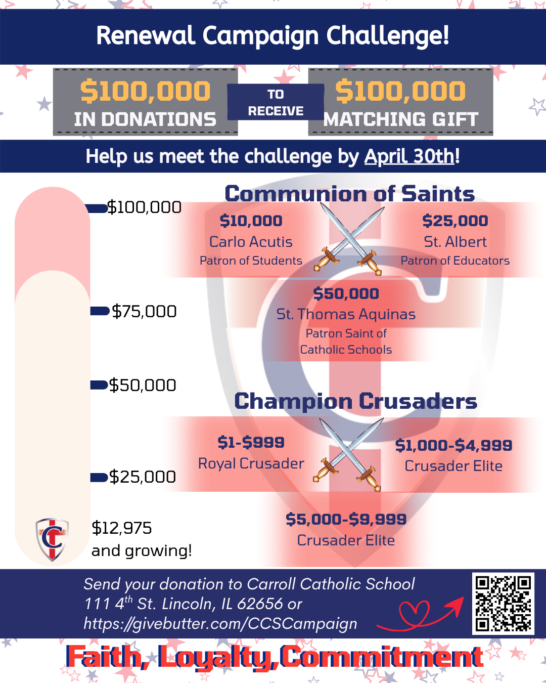 Thank you once again to all who could attend our Renewal Campaign meeting Monday evening. It was fantastic to see so many students, families, and supporters of the school. The biggest news of the evening was the $100,000 matching gift challenge from generous friends of CCS! I have no doubt if we come together as a faith community on behalf of our students and the mission of Carroll Catholic School that we will meet, if not exceed, the challenge of raising $100,000!