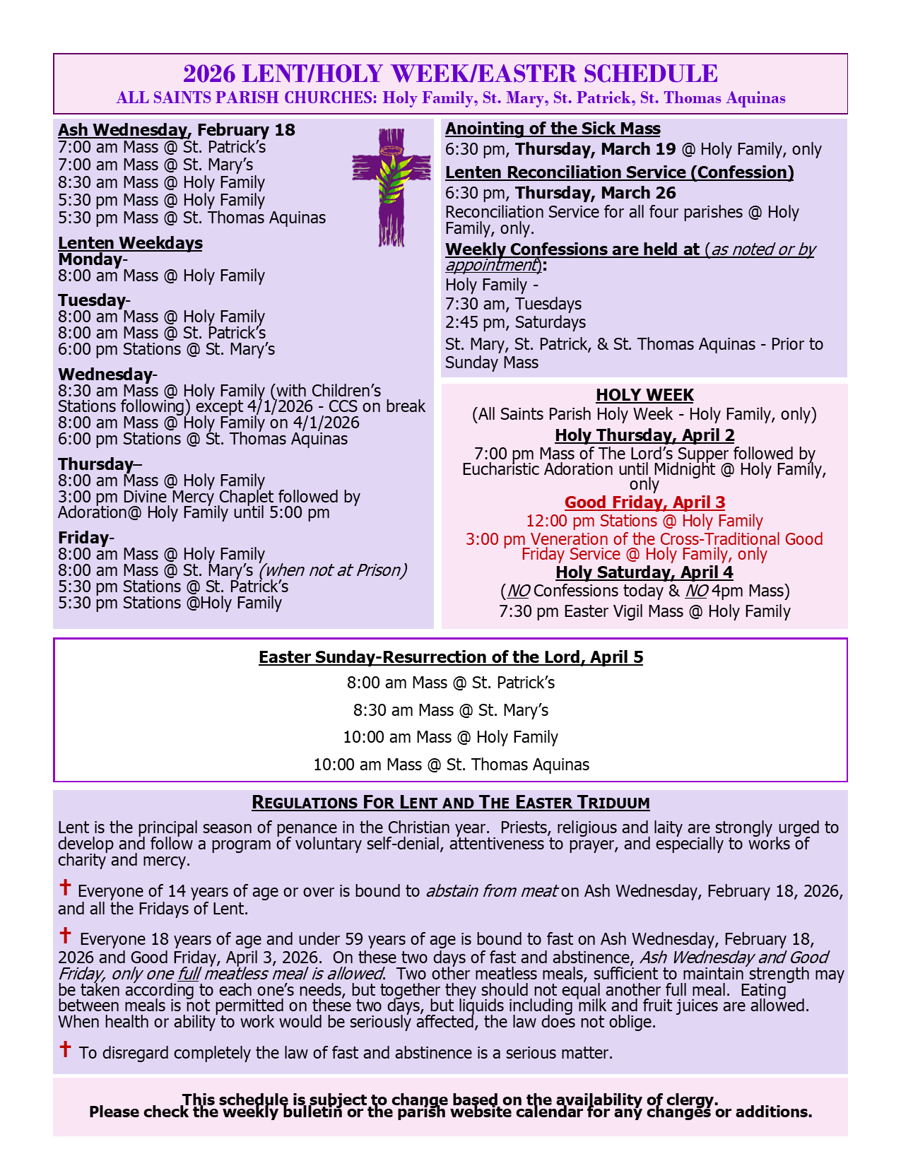 Join us at our next meeting to be held on Thursday, February 26, 2026, from 7pm to 8pm. We will meet in the Bride’s Room at Holy Family for prayer. We will come together to pray for your needs and thank God for your blessings. We will gather together to pray for each other, our community, and the world. All are welcome and we look forward to seeing you!
